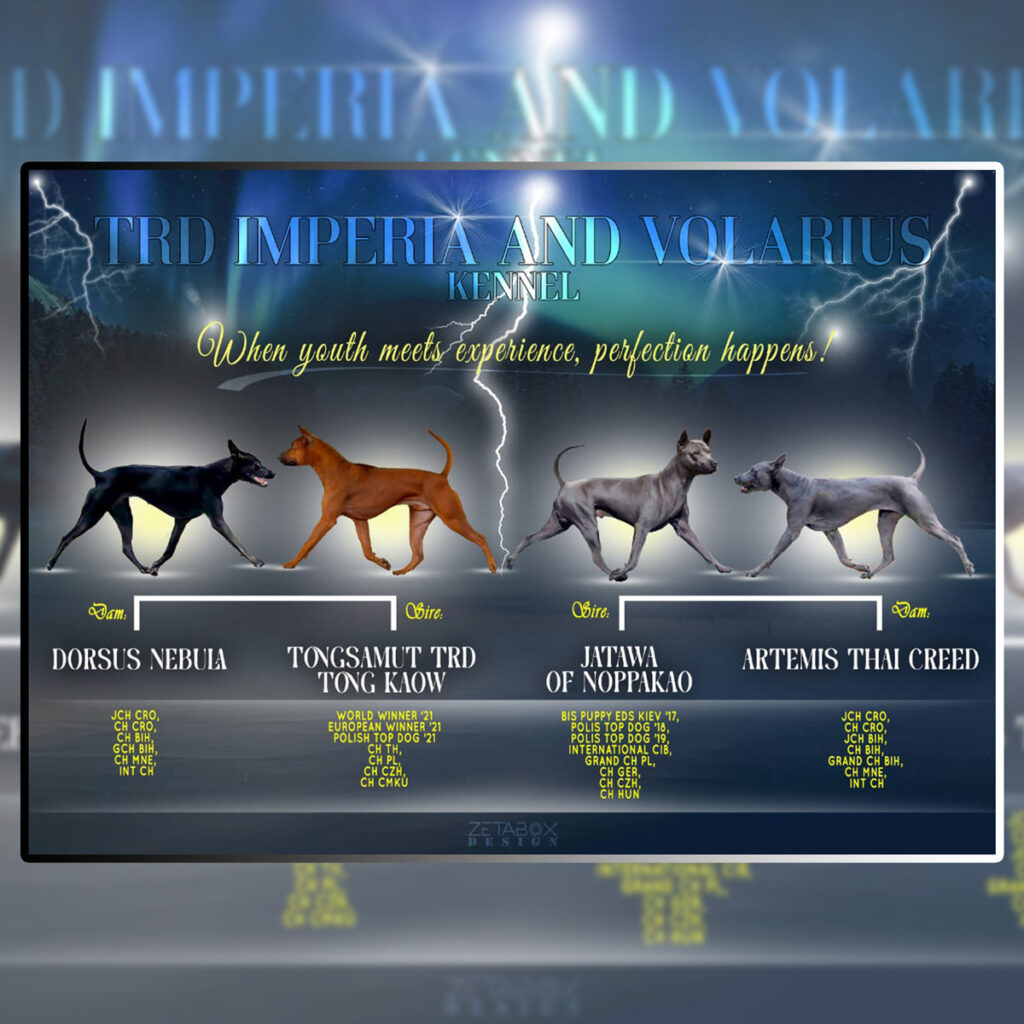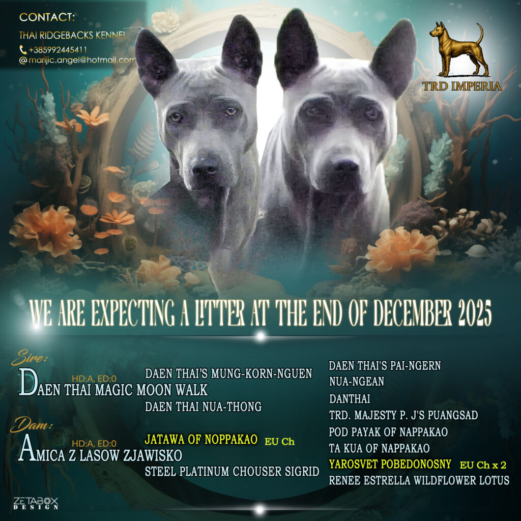 Danas uzgajam tajlandske riđbeke u sve četiri priznate boje, pažljivo birajući i uvozeći pse iz svjetski priznatih uzgajivačnica. Kombinacijom krvnih linija europskih i svjetskih prvaka težim očuvati autentičnost pasmine, uz stalno unapređenje zdravlja, građe i karaktera.